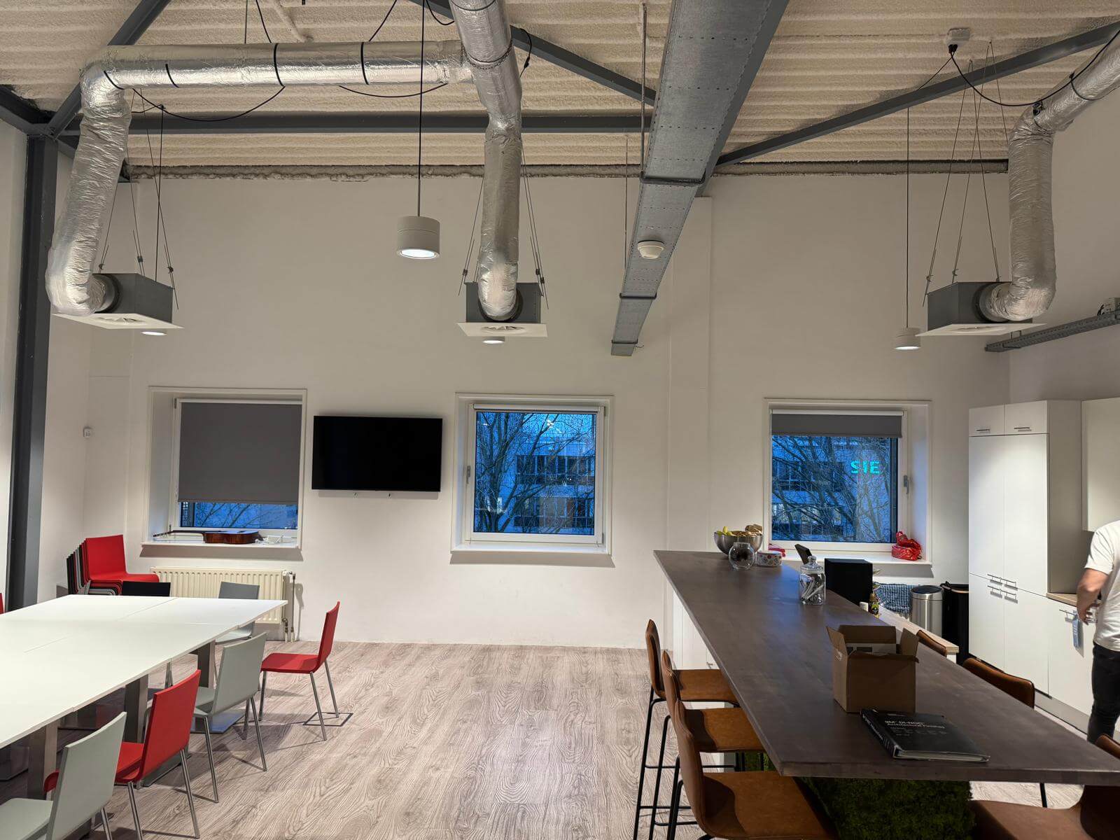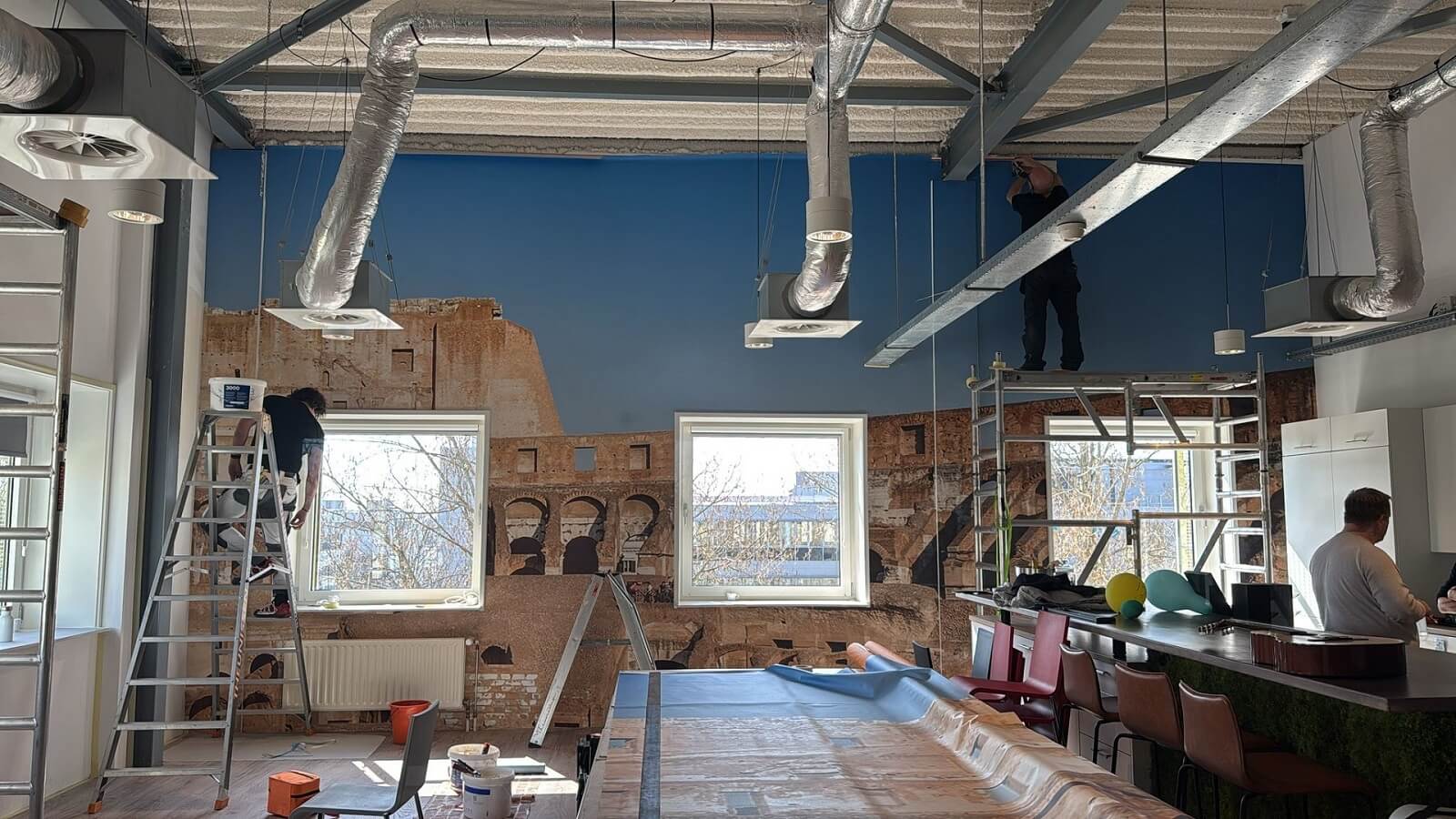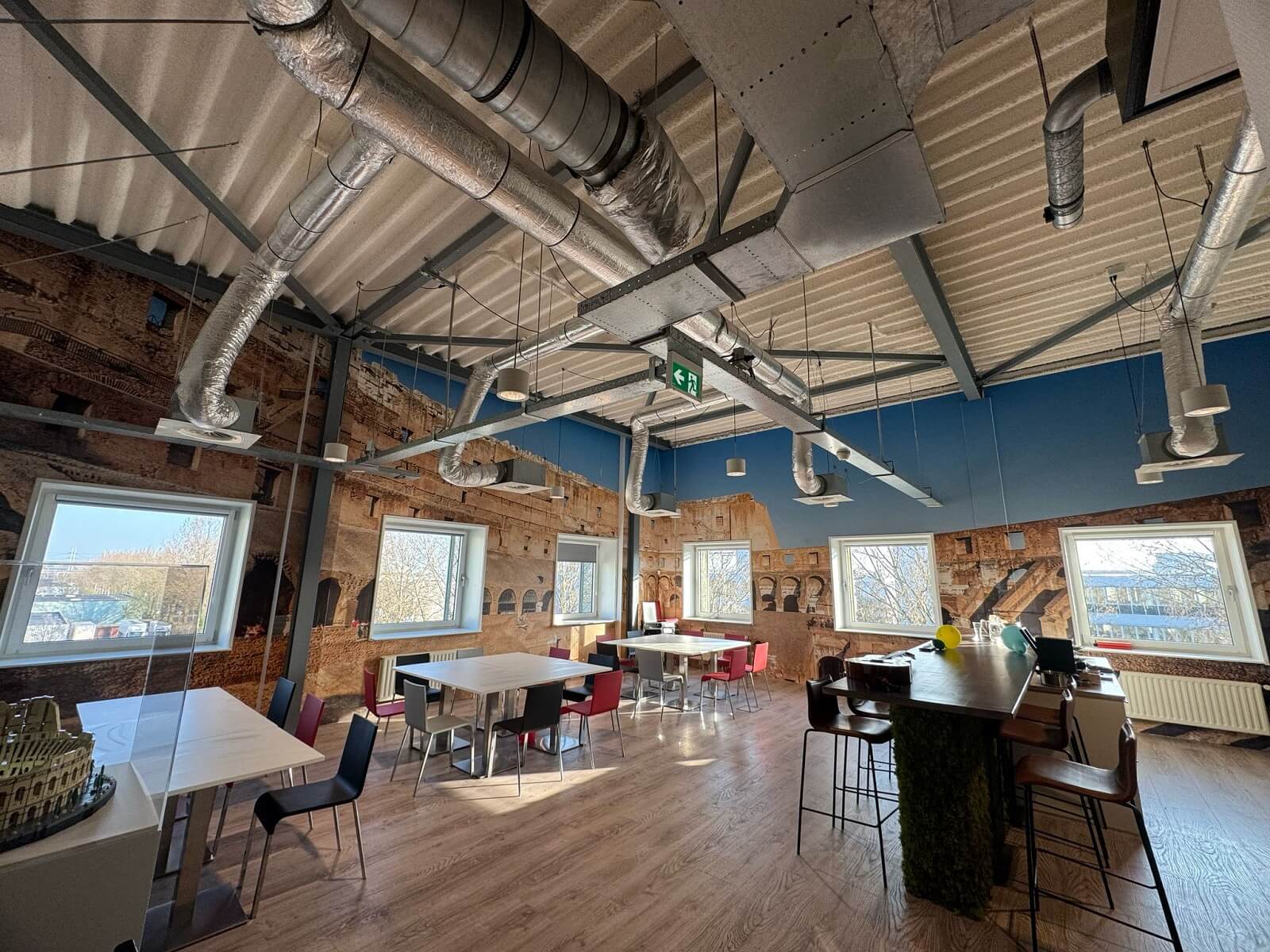 Een van de meest opvallende transformaties was de restyling van de kantine. Deze ruimte, voorheen standaard wit en weinig inspirerend, is omgetoverd tot een sfeervolle plek met een indrukwekkend Colosseum-thema. Met behulp van speciaal geselecteerde interieurfolies is er een geheel nieuwe beleving gecreëerd — zonder ingrijpende verbouwingen of lange stilstand van de ruimte.